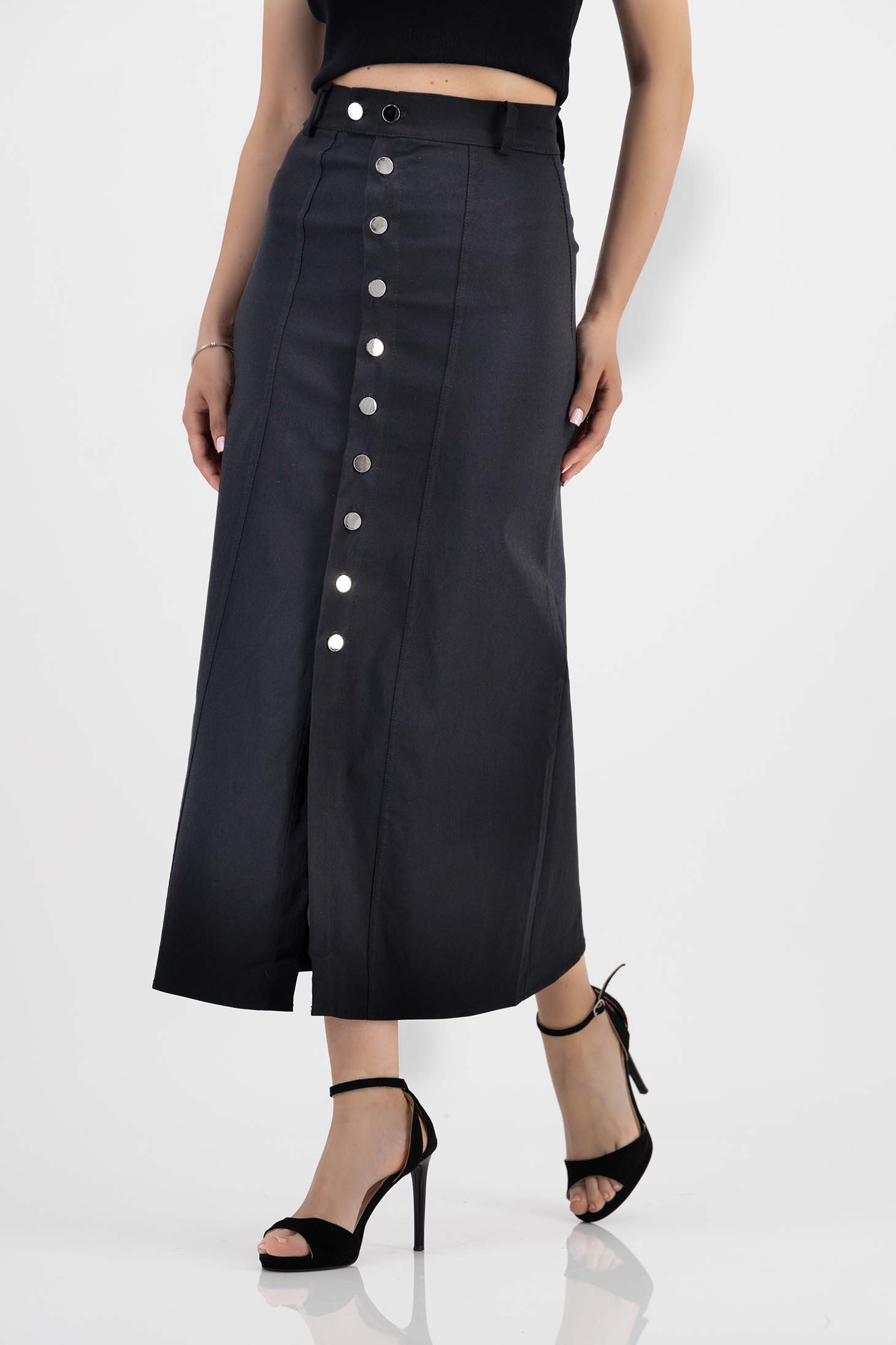 Suknja od crnog strecha, midi kroja olovka tipa s prednjim prorezom i visokim strukom - SunShine